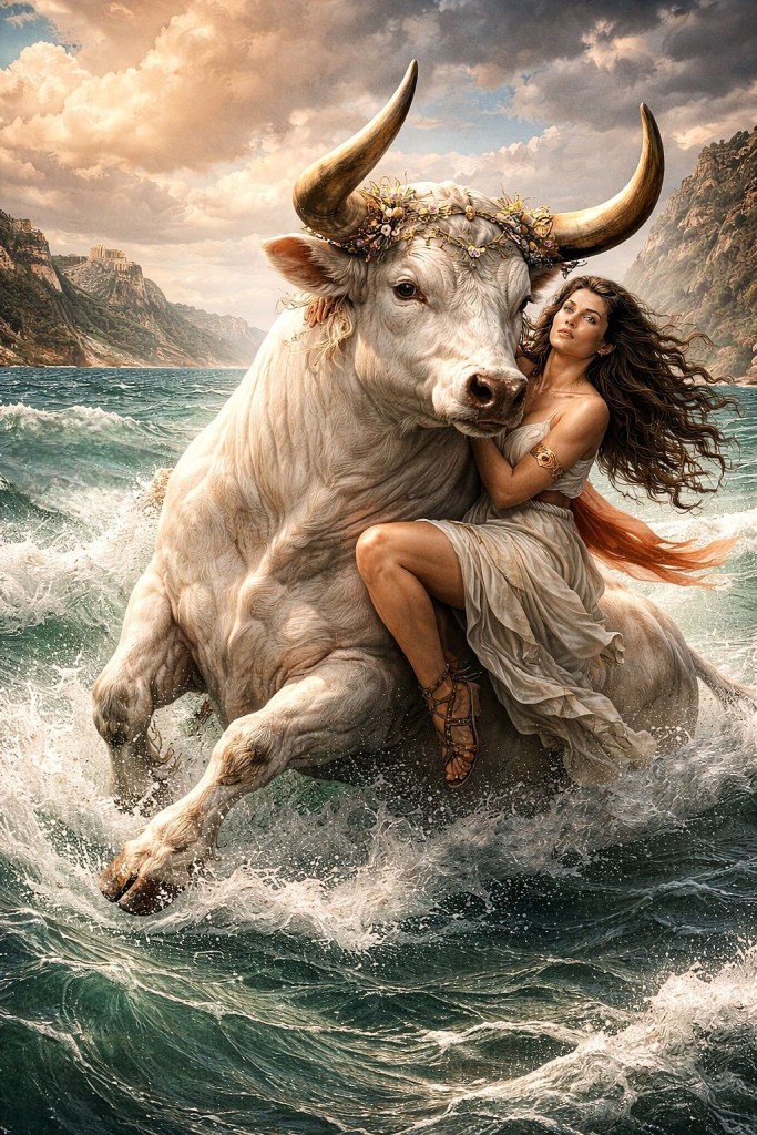 Notre mythologie européenne est tellement plus belle que les fables misérabilistes du christianisme… Dans la mythologie grecque, Zeus tomba amoureux de la princesse Europe. Pour s’approcher d’elle, il se métamorphosa en un doux taureau blanc. Europe, attirée par le taureau, le para de fleurs et grimpa sur son dos. À cet instant, Zeus se précipita dans la mer et l’emporta jusqu’en Crète. Là, il révéla sa véritable apparence divine. Europe devint plus tard la mère de trois fils – Minos, Rhadamanthe et Sarpédon – et épousa finalement le roi Astérios de Crète.