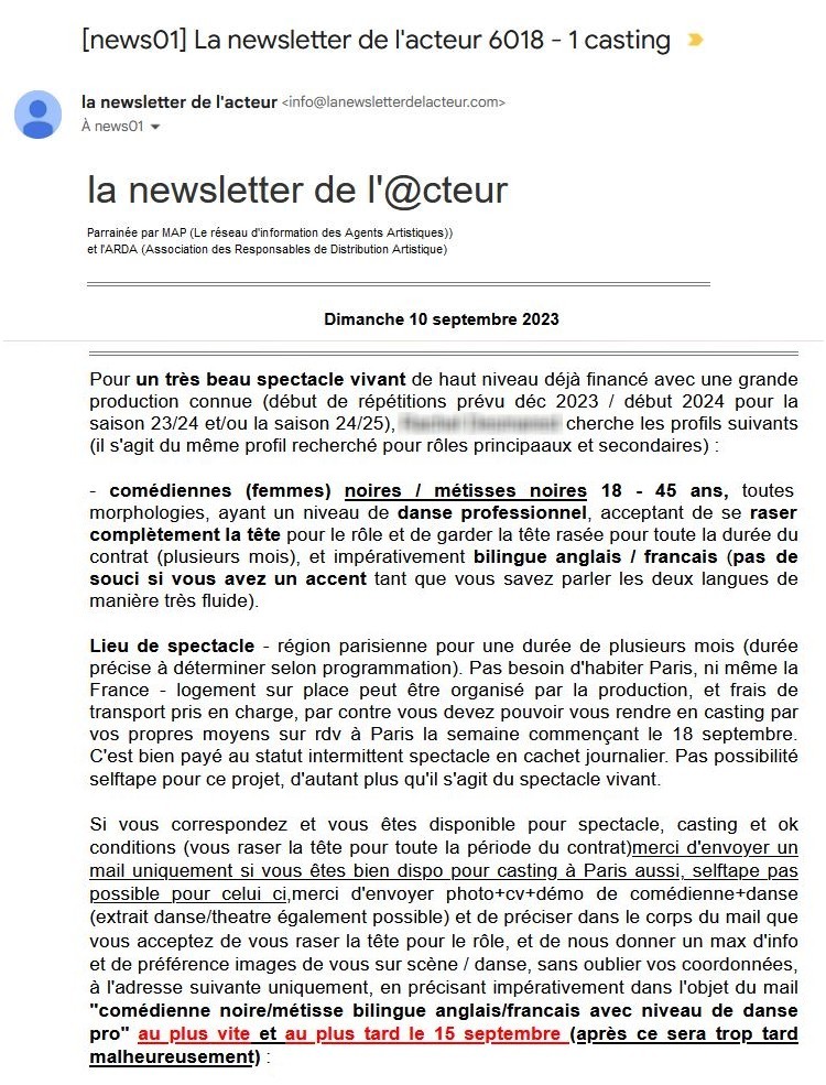 Nous le disions il y a quelques jours, et tout le monde le voit à la télé, sur les affiches publicitaires, le métis, le black, le « racisé » est partout dans la production d’image en France. C’est manifestement une volonté du pouvoir, avec instructions établies en matière de quotas, à destination de qui ne serait pas d’ores et déjà un militant acquis à cela chez les professionnels, agences de pub, scénaristes, metteurs en scène, réalisateurs… Un microcosme gauchiste qui n’a aucune difficulté à adhérer à cette infâmie. Nous tenons la capture d’écran qui suit d’une comédienne professionnelle française, blanche, abonnée aux divers sites professionnels de propositions d’emplois, castings, recherches pour projets, sites qui font une livraison quotidienne des annonces d’employeurs à leurs abonnés. Elle témoigne que l’exemple ci-dessous est une constante, pour les projets cinéma, théâtre, publicité rémunérés. Projets rémunérés pour lesquels les profils demandés sont systématiquement métis, black, extra-européens de toutes sortes. Oh, comme chacun peut le voir en allumant son téléviseur, en ouvrant un magazine, en prenant le métro, il y a bien sûr des visages blancs dans toute la production de l’image. Mais ne vous y trompez pas, ils sont peu nombreux et ce sont des gens qui sont déjà dans le sérail et verrouillent jalousement l’activité. Dans le sérail par cooptation facilitée parce qu’ils y ont un membre familial, des « fils ou fille de », parce qu’ils ont accepté de coucher dans un troc immonde courant dans ces professions d’emploi ou de carrière facilités contre faveurs sexuelles, parce qu’ils ont un agent artistique qui a les vrais bons contacts relationnels, etc. et qui n’ont donc pas à recourir aux petites annonces réservées aux soutiers de la profession blancs et extérieurs à ces critères. Pour ces derniers, extérieurs au sérail et qui par définition ne sont pas extra-européens, qui veulent simplement travailler honnêtement et sur la base de la reconnaissance de leur talent, pas de leurs copinages, il n’y a plus d’emploi rémunéré, les offres sont rarissimes et entraînent un tel nombre de candidatures que la probabilité de décrocher le rôle est devenu illusoire. Ils sont en revanche demandés sans problème pour des projets bénévoles, donc non rémunérés. Notons par ailleurs que jamais l’on ne voit les branches Spectacle des grands syndicats institutionnels protester contre cette situation scandaleuse. On ne saurait s’en étonner, ils sont tous partisans du Grand Remplacement.