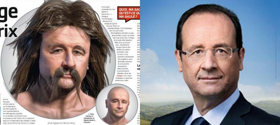 L’étrange ressemblance entre le héros Gaulois Vercingétorix selon Science & Vie Junior, et François Hollande sur son affiche de campagne en 2012.