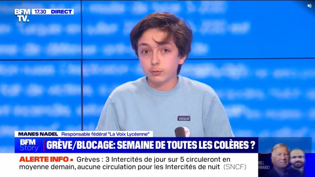 Il n’a pas dix-huit ans, donc aucune expérience de la vie, donc aucune légitimité, et pourtant il a les médias du Système à sa botte. Il épate comme ces enfants que l’on fait jouer à l’adulte dans les concours de danse de salon. Il n’est qu’un perroquet qui régurgite ce qu’il a appris dans le bain familial, mais il est doué pour cela. Sans les entrées relationnelles de maman qui est préfet, Manès Nadel, bambin gauchiste, serait un parfait inconnu qui n’aurait pas dépassé la notoriété d’un représentant de la FIDL dans son lycée et dans les locaux des RG du département.