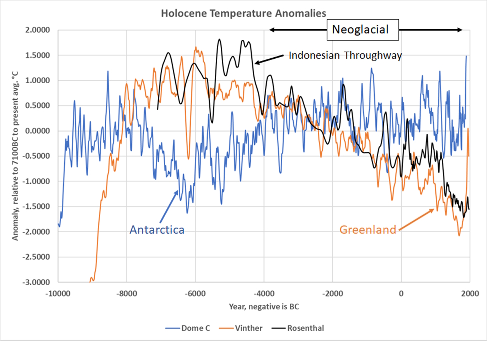 Les températures reconstituées pour l’Holocène à partir des données de l’Antarctique (Dôme C, Jouzel et al., 2007), du Groenland (Vinther) et d’Indonésie (Rosenthal) mettent en évidence la période climatique néoglaciaire. Cette dernière correspond à un refroidissement notable dans l’hémisphère nord.