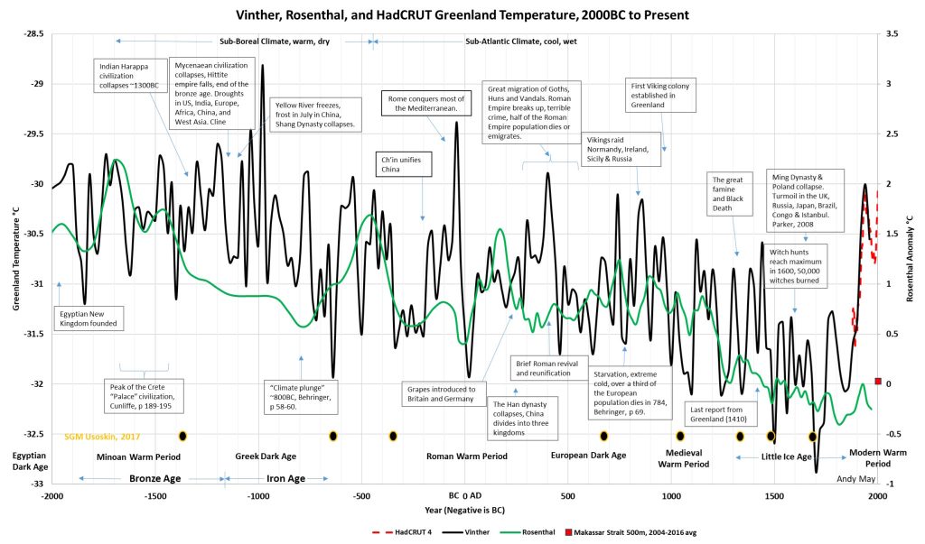 Les reconstructions de température de Vinther (noir) et Rosenthal (vert), comparées à des événements historiques majeurs. Les anomalies HadCRUT4 pour la région autour du Groenland sont représentées par une ligne rouge en pointillés, et les températures à 500 mètres de profondeur dans le détroit de Makassar (données de l’Université de Hambourg) sont indiquées par des carrés rouges.