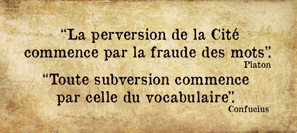 Brouiller le sens des mots, c’est brouiller les esprits, et permettre de leur imposer n’importe quoi. En revanche, quiconque possède les mots, possède la pensée, et si on possède la pensée, on possède tout le reste. Le combat culturel, c’est avant tout la guerre des mots. Avant Platon, Confucius lui aussi s’est exprimé sur le sujet : « toute subversion commence par celle du vocabulaire ».