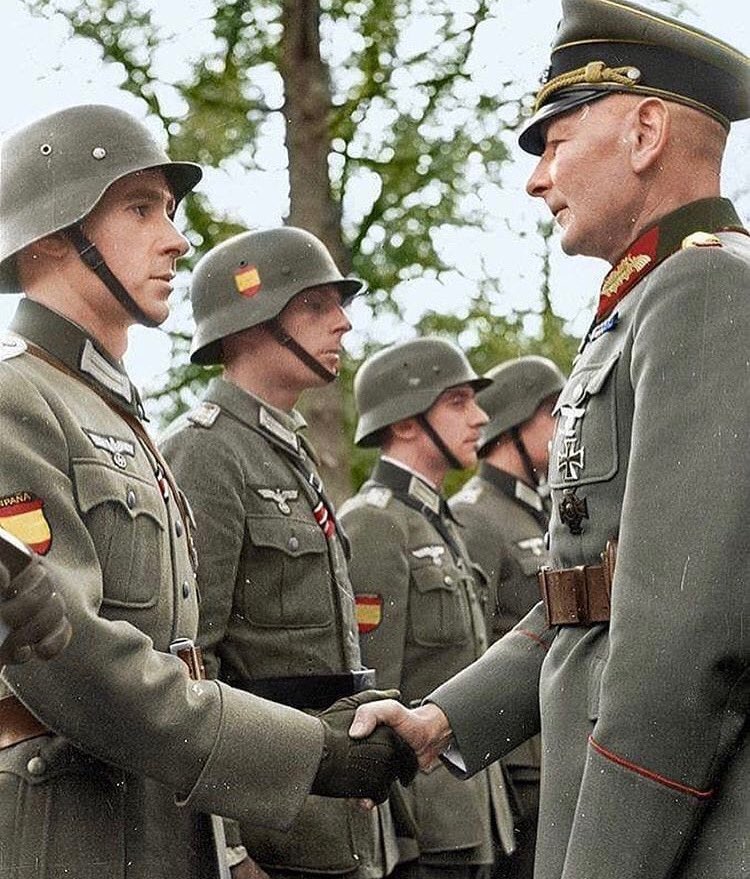 Ici le général de la Wehrmacht Philipp Kleffel saluant des volontaires espagnols de la División Azul combattant sur le front de l’Est contre Staline. Ces hommes lucides et sensés avaient compris l’importance de l’opposition à l’avancée du bolchevisme sur l’Europe. Aujourd’hui, le communisme faisant partie des vainqueurs de 1945, les dictionnaires, très malhonnêtement, occultent ce point fondamental et salvateur de l’Europe, pour ne faire du fascisme qu’une présentation qui le diabolise en le qualifiant uniquement de régime autoritaire (Larousse : Qui impose une autorité arbitraire, dictatoriale et violente à son entourage. Abréviation populaire : facho)