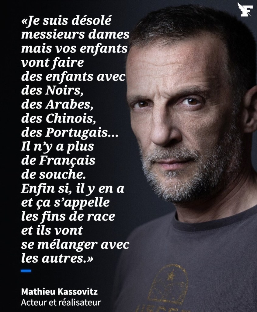 Oui, merci à ce fils d’une nation rendue nomade par les aléas et les infortunes de l’Histoire, d’avoir clairement enfoncé le clou quant au rêve obsessionnel qu’expriment incessamment des gens (les BHL, Benamou, Attali, Cohn-Bendit, Lang, Konopnicki, Kouchner, la Licra, etc… qui ont empoisonné la tête des Français – décidément bien perméables – depuis des décennies) appelant ceux qui sont enracinés à perdre leurs racines, appelant à dissoudre les autres nations dans le métissage. Entreprise autant illégitime que perverse que les identitaires européens n’ont de cesse de dénoncer et de combattre. Il ne fait que perpétuer cette volonté portée dans le monde politique comme dans le monde culturel, qui n’a jamais par ailleurs été cachée, mais au contraire clairement exprimée, à commencer par Nicolas Sarkozy dans son insupportable discours à l’École Polytechnique en 2008 sur le « métissage obligatoire ». Espérons que cet affichage odieux ouvrira les yeux en nombre sur le dessein que prévoit la caste gouvernante mondialiste à laquelle appartient tout ce qui n’est pas identitaire. Nous faisions récemment un récapitulatif intitulé Sous quelle influence s’est faite la submersion migratoire ? à consulter tout comme notre rappel d’articles sur cette entreprise, réunis sous le titre Imaginez si quelqu’un souhaitait que son peuple n’existe plus ! effectué suite à la première déclaration de ce personnage quelques jours auparavant. Dispersés en diaspora par l’Histoire, sans territoire propre, l’identité et la religion des Juifs leur ont logiquement fait office de nation, jusqu’en 1948. Est-ce pour autant une raison, parce qu’ils furent privés de leur territoire antique, qu’il leur faut agir pour que les autres nations disparaissent dans la société multiraciale et perdent leur identité ? Evidemment non. Cette idée et l’activisme qui la porte n’ont aucune justification. Certains rabbins apparentent à un génocide le fait que des hommes juifs fondent des familles avec des femmes non-juives, parce que les enfants seront des « juifs manquants », ils ne seront pas juifs (du fait que selon leur loi religieuse, la Halakha, c’est la mère qui transmet la judéité). Ils ont pris soin de préserver leur identité au fil des siècles et ils y tiennent légitimement comme à la prunelle de leurs yeux. Et nous devrions, quant à nous, laisser une influence cosmopolite détruire notre propre identié par la submersion migratoire de nos pays et par l’incitation/imposition du métissage ? En nous qualifiant aimablement de « fin de race », Mathieu Kassovitz prend ses désirs pour des réalités. Nous ne sommes pas finis. Le combat pour l’identité sera celui de ce XXIème siècle.