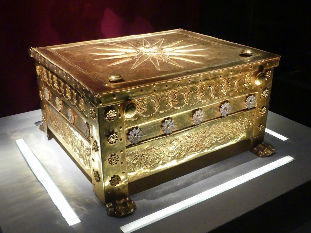 Merveille parmi les merveilles de l’orfèvrerie grecque, ce larnax – coffret funéraire – en or contenait les ossements calcinés de Philippe II, roi des Macédoniens, père d’Alexandre le Grand, soigneusement enveloppés dans un manteau de pourpre près d’une couronne de chêne. Sa forme simple, sublimée par le travail remarquable de l’or, rappelle que les larnakes étaient originellement en bois.