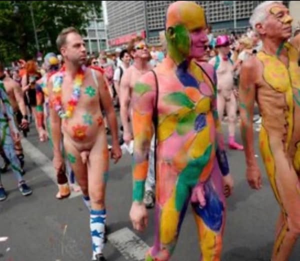À droite, quelque part en Allemagne actuelle, la parade gay de la Saint-Christophe, bites à l’air