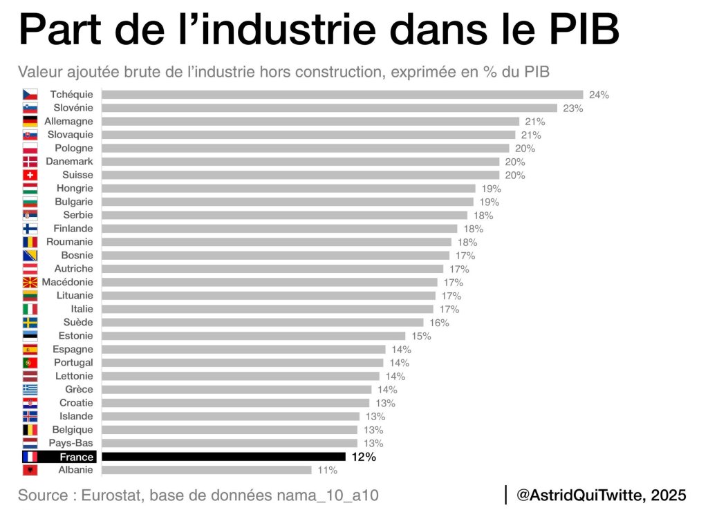 Si l’on en croit cette statistique Eurostat, il n’y a PAS eu de RÉINDUSTRIALISATION. La France est le pays le moins industrialisé de l’Union européenne, si on excepte les petits États comme Malte.