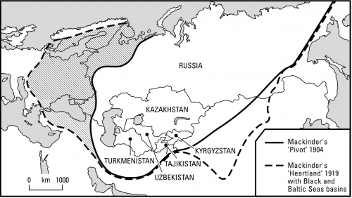 Plus tard, en 1919, à la fin de la Première Guerre mondiale, Mackinder reformule ses théories dans son célèbre essai Democratic Ideals and Reality. À cette époque, le terme « pivot » n’était plus adapté à la situation internationale telle qu’elle était ressortie des événements de cette première crise mondiale commune et de la guerre. L’idée même de « région pivot » a donc évolué de manière plus subtile et plus complexe, ne se limitant plus à la description d’une réalité géographique, pour devenir les concepts d’« idéaux », de « réalités » et, surtout, de « Heartland ». Néanmoins, ce qu’il faut surtout souligner, c’est que la thèse de 1904, bien qu’elle ait modifié l’idée principale du sujet évoqué, restait parfaitement valable, aux yeux de Mackinder, pour la situation internationale mondiale de 1919. Les termes « zone pivot » et « cœur du continent » étaient utilisés pour décrire une réalité immuable : celle de l’hégémonie suprême de la puissance qui contrôlerait la zone en question.
