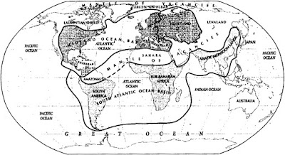 À l’extérieur de la ceinture se trouve le Grand Océan, qui comprend le Pacifique, l’océan Indien et l’Atlantique Sud, ainsi que les terres qui s’y déversent : les terres asiatiques soumises à la mousson, l’Océanie, l’Amérique du Sud et l’Afrique au sud du Sahara.