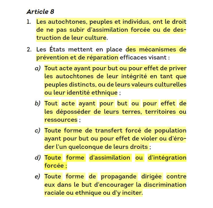 Déclaration des Nations Unies sur les droits des peuples autochtones, article 8 (2007). Lisez cela avec le peuple français en tête, dans le contexte de la submersion migratoire extra-européenne…