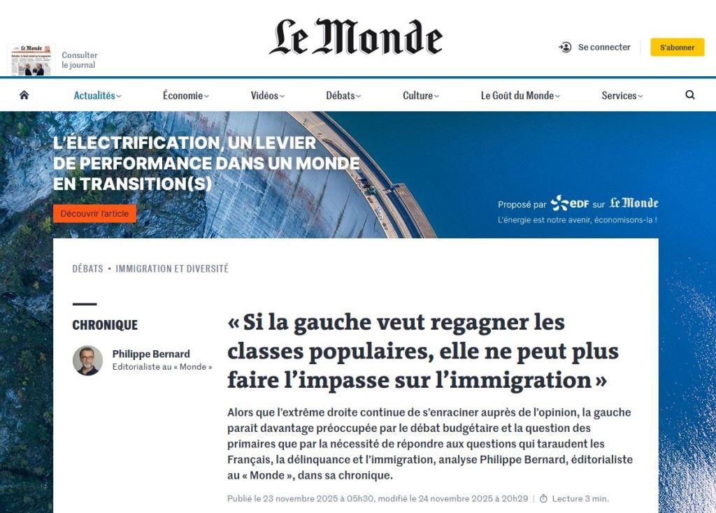 La majorité des gens n’étant malheureusement pas capables d’anticiper la compréhension de ce qui va advenir si l’on laisse une menace prospérer, devant être concrètement confrontés au péril pour se réveiller enfin, il aura fallu en arriver là pour que le sujet de l’excès d’immigration brise le plafond de verre dans les préoccupations des Français et s’installe comme un thème incontournable du débat public, au grand dam de la gouvernance et de la gauche récemment alertée dans le quotidien Le Monde ce 23 novembre 2025 par un article de Philippe Bernard, sous un titre qui est à la fois un aveu de la trahison de la gauche vis-à-vis du peuple, et de sa dite « impasse », négation volontaire du problème puisqu’elle n’a cessé de chérir cette politique de submersion :