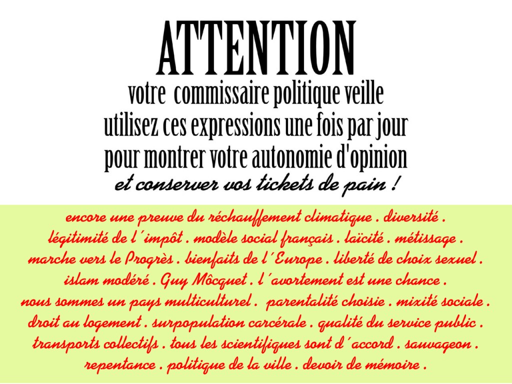 Autre concept de Orwell, dont la mise en pratique est dénoncée depuis plusieurs décennies par les résistants à l’oligarchie en place : la Novlangue et son invention d’un vocabulaire spécifique, avec l’idée qu’il faut restreindre l’espace mental en réduisant le nombre de mots, pour que l’être humain ayant de moins en moins de mots à l’esprit, et donc de moins en moins de liberté à l’esprit, soit obligé de penser dans les catégories du régime. Un appauvrissement du vocabulaire voulu pour à terme empêcher la possibilité d’exprimer toute contestation. Quand on voit un système médiatique qui matraque sans arrêt certains mots du lexique gauchiste, intolérance, vivre-ensemble, phobie, extrême-droite, on comprend qu’à travers cela on restreint le périmètre de la pensée, on oblige les gens à fonctionner avec toujours les mêmes cent mots, et on appelle ça du journalisme objectif, il y a une Novlangue journalistique aujourd’hui.