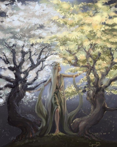 Dans Le Silmarillion, Tolkien illustre ce cycle à travers l’histoire des deux arbres de Yavanna. Ces deux arbres sont étroitement liés à la mythologie germanique, et plus particulièrement à Yggdrasil, l’if sacré des Germains. Yavanna, tantôt déesse, tantôt arbre sacré reliant la terre et le ciel, veille sur Laurelin et Telperion, deux arbres qui partagent avec l’if sacré des Germains la notion de fertilité et de croissance, ainsi que la menace de leur destruction.