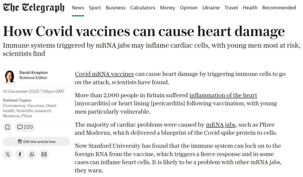 « Des scientifiques ont découvert que les injections d’ARNm contre la Covid-19 peuvent provoquer des lésions cardiaques en incitant les cellules immunitaires à attaquer le cœur. » – The Telegraph