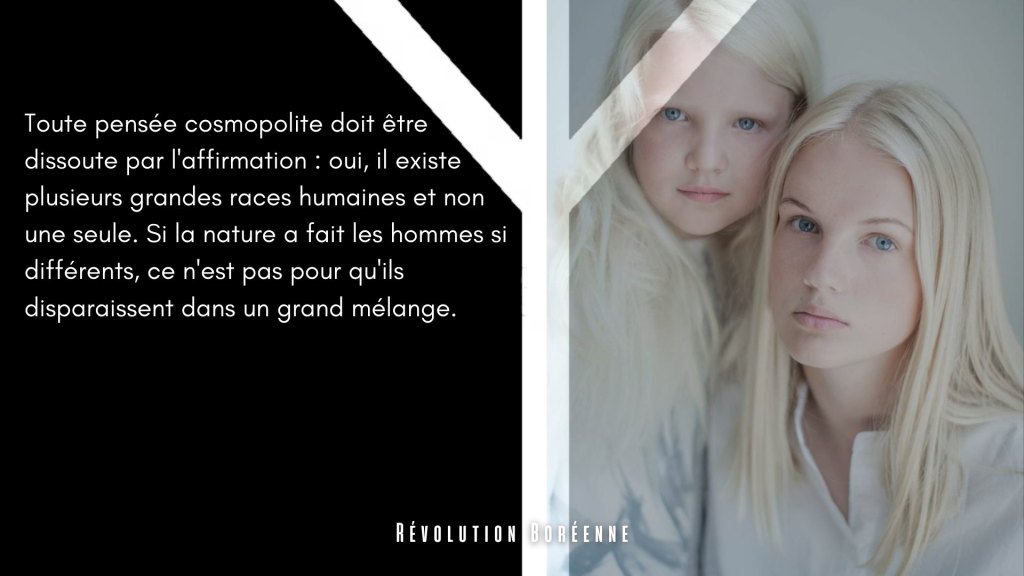 Ainsi, la diversité du vivant est conditionnée par la diversité des espèces. Et quelle que soit l’explication de cette division, qu’elle soit d’origine divine ou évolutionniste, la valeur première est la préservation de son espèce et sa reproduction. La vie elle-même nous l’enseigne et nous y pousse, à moins bien sûr d’avoir la pensée empoisonnée par une propagande contre-nature. Toute idéologie ou théorie, comme celles du cosmopolitisme et du métissage* qui contredit cette loi naturelle non seulement s’oppose à la vie, mais la nie purement et simplement.