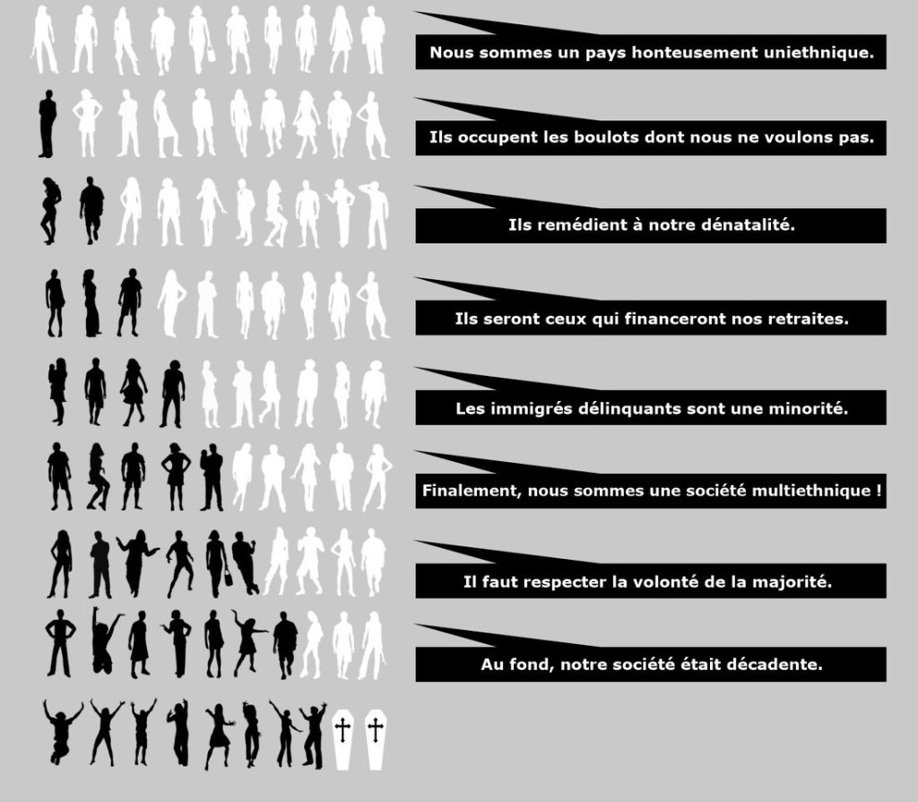 Les années ont passé, c’est une image déjà ancienne (où chaque détail compte) dans le monde de la Résistance française à la submersion migratoire afro-musulmane, que nous affichons ci-après, qui annonçait ce que commencent à vivre les villes de la petite ceinture parisienne anciennement tenues par le Parti socialiste et surtout par le Parti communiste, ces partis qui ont fait et materné la submersion migratoire qui les dévore aujourd’hui, des villes où la bascule démographique a eu lieu en faveur de l’immigration, et qui viennent d’en être chassés par l’élection de maires afro-musulmans portés par le parti islamo-gauchiste La France Insoumise. Avertissement d’un devenir évident, que n’ont pas voulu entendre les Français depuis cinquante ans, et qui ne fera que s’étendre à de nouvelles zones territoriales du pays. Le faible subit ce qu’il doi subir, a dit Thucydide, il aurait pu y ajouter l’idiot, nous nous chargeons de le faire.