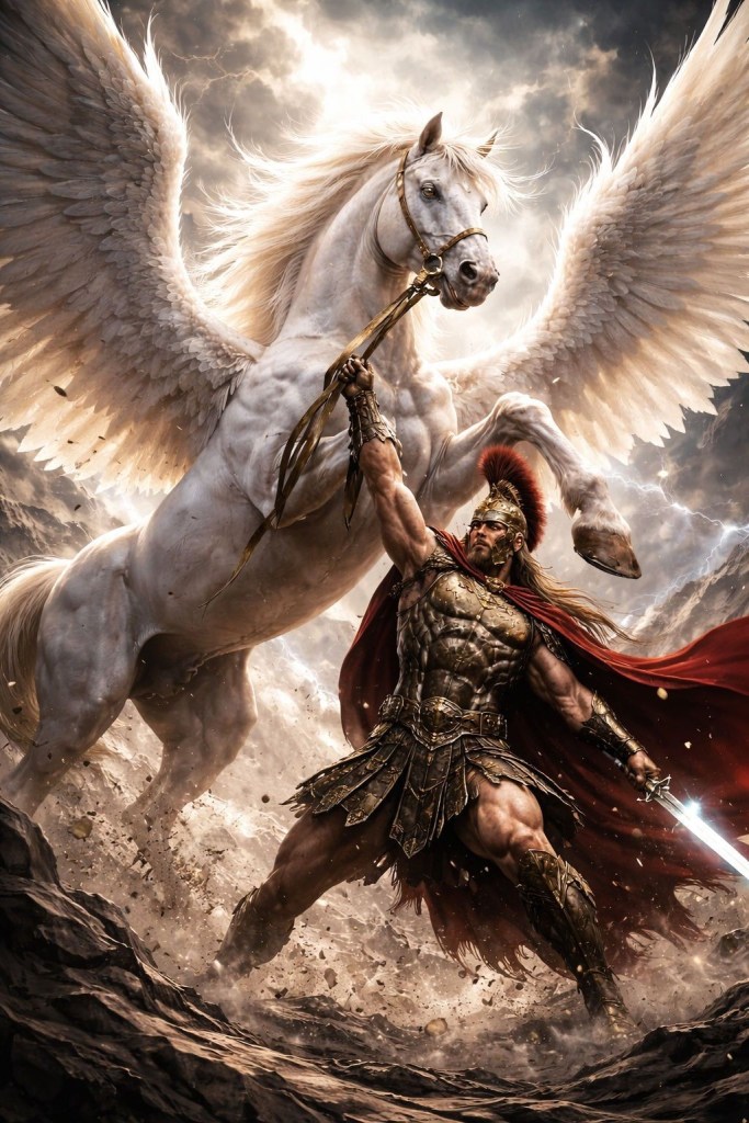 Bellérophon ne dompta pas Pégase par la seule force, mais grâce à l’aide et à la discipline divines. Selon la mythologie grecque, Pégase était insaisissable par les moyens ordinaires. Après de nombreux échecs, Bellérophon implora les dieux. Athéna lui apparut en songe et lui offrit un mors d’or. À son réveil, le mors était à ses côtés. Il trouva Pégase s’abreuvant à la source de Pirène, à Corinthe. Tandis que le cheval ailé se cabrait, Bellérophon, avec calme, lui mit le mors d’Athéna. La magie de ce don permit de maîtriser Pégase, non en brisant sa force, mais en unissant la volonté humaine à l’ordre divin. Ceci est symboliquement important : Pégase se soumet non à la force, mais à la sagesse, à la retenue et à la faveur des dieux. C’est seulement ainsi que Bellérophon put le chevaucher pour vaincre la Chimère et accomplir des exploits héroïques.
