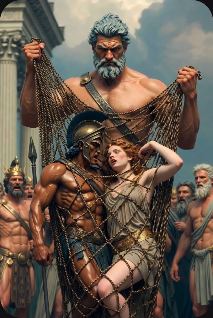 Héphaïstos était l’époux d’Aphrodite, un mariage arrangé par Zeus. Arès, dieu de la guerre, devint l’amant passionné de la déesse. Lorsque Héphaïstos découvrit leur liaison, il emprisonna les amants dans un filet de bronze incassable et les exposa aux Olympiens – l’une des plus humiliantes scènes de la mythologie grecque.