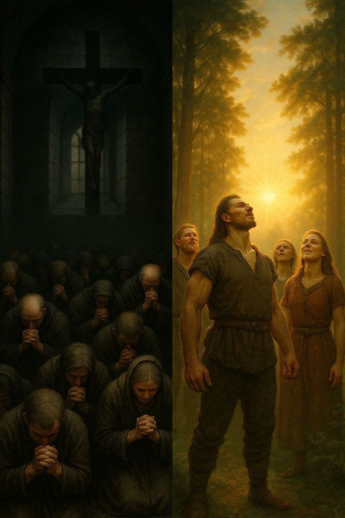 Le chrétien prie à genoux, le païen se tient debout. L’un symbolise la soumission, l’autre la fierté.