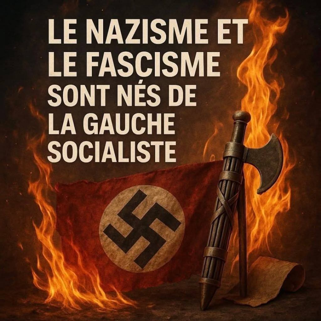 Nous disent certaines personnes de droite qui se pensent instruites à qui l’on a appris à être hostiles à ces doctrines. En effet, c’est absolument exact, fascisme et nazisme sont du socialisme. Mais ces gens ne voient pas un élément fondamental : le nazisme et le fascisme sont des doctrines sociales qui portent leur intérêt sur leurs populations respectives, l’amour des Italiens pour le fascisme, l’amour des Allemands pour le nazisme. Tout comme le franquisme s’est attaché à la protection des Espagnols. Et ces doctrines améliorèrent considérablement la vie de leurs peuples respectifs, avant d’être vaincues. Un socialisme d’intérêt national donc, parfaitement légitime, que ceux qui ne supportent pas cette idée devaient forcément diaboliser. Un socialisme national qui est tout le contraire du socialisme INTERNATIONALISTE cosmopolite des bolcheviques marxistes et des francs-maçons vainqueurs de 1945 sous lequel nous vivons encore aujourd’hui. Les flammes de cette image, sont celles de nos pays dans le feu des émeutes « racisées », frappés par l’explosion de la criminalité, ce sont les flammes de nos pays européens menacés de disparition, ce sont celles de la merde générée par ce socialisme marxiste internationaliste, pas celles des doctrines sociales nationales. « Learn the difference », comme le dit l’expression anglaise. Qu’il sera long de dépolluer les têtes de quatre-vingts ans d’intox !…